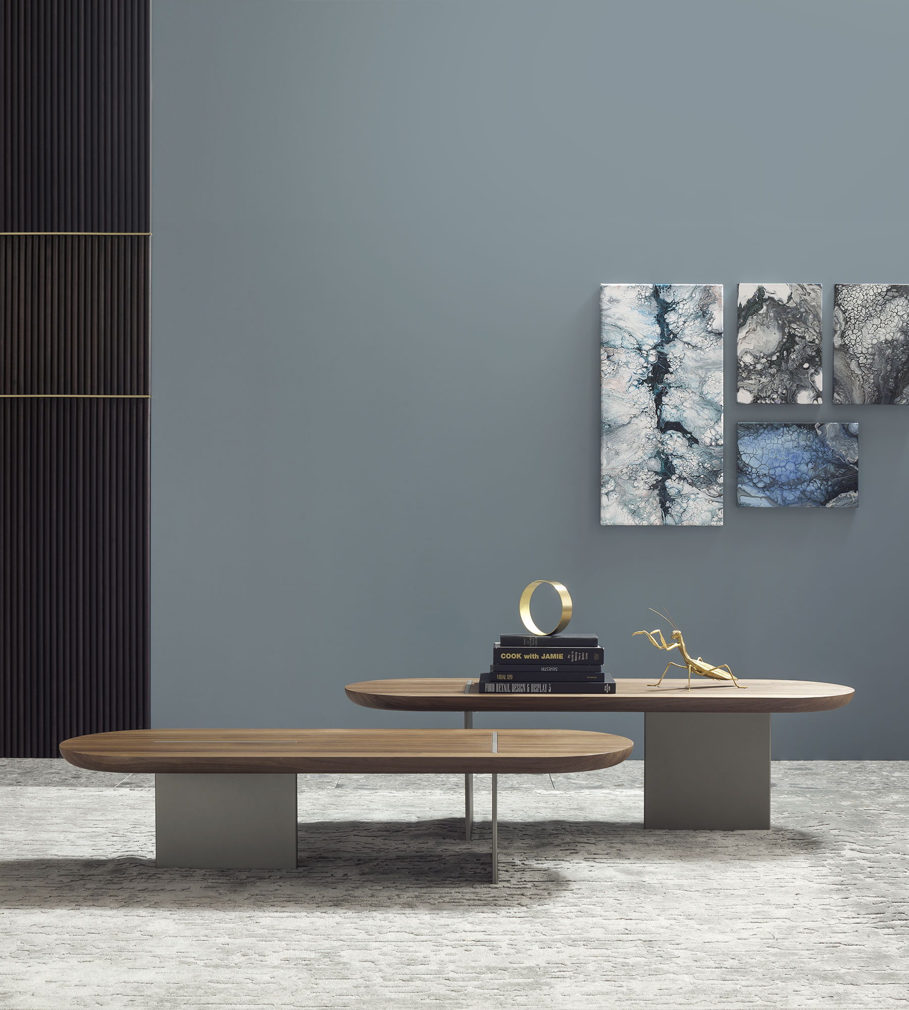 Coffee Tables with base in rounded, epoxy powder-coated metal and champagne finish.
