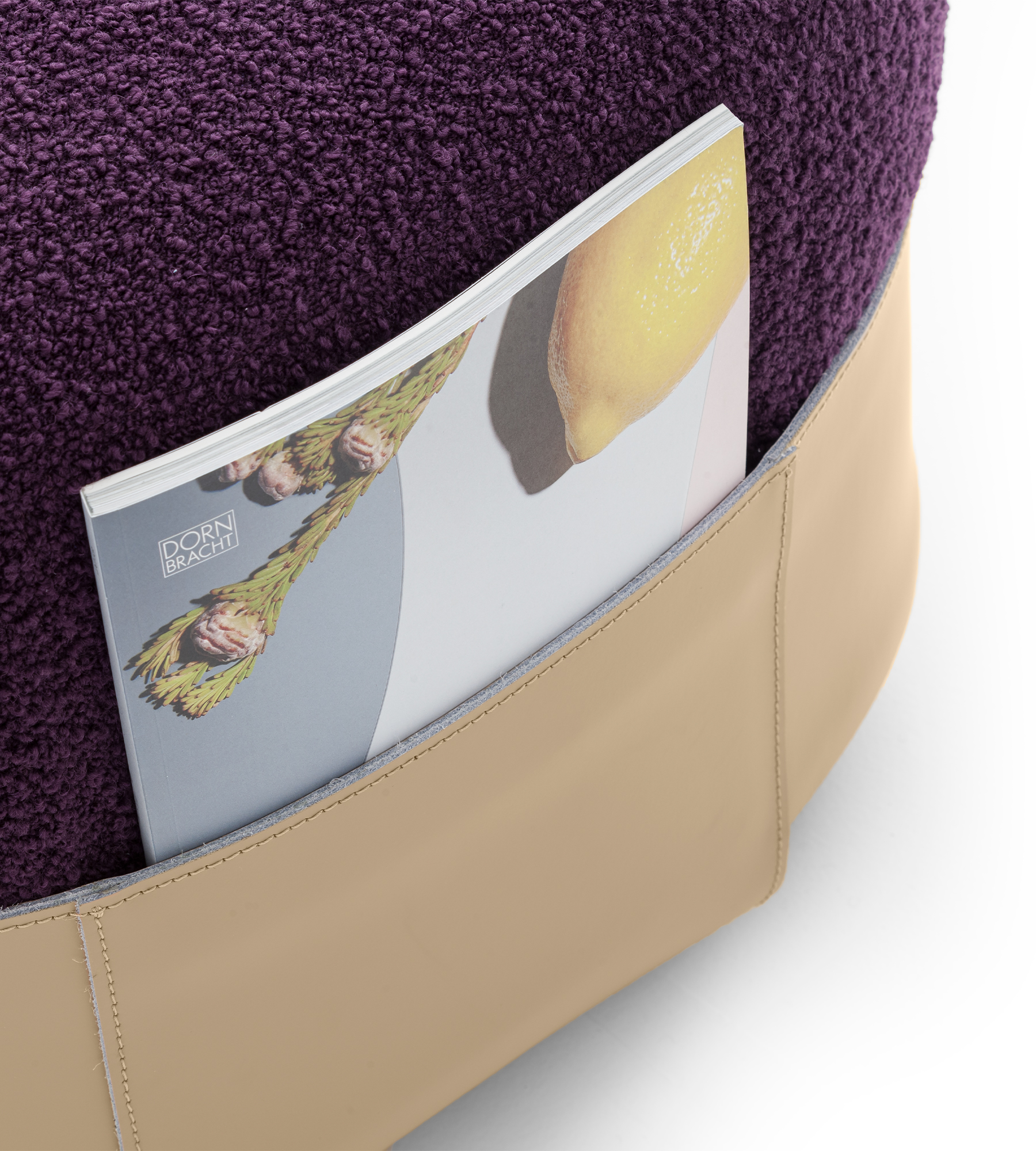 A soft bouclé wool fabric combined with leather upholstery is just the right combination for a youthful living room full of colour! An extra touch? The magazine holder feature of the leather section!