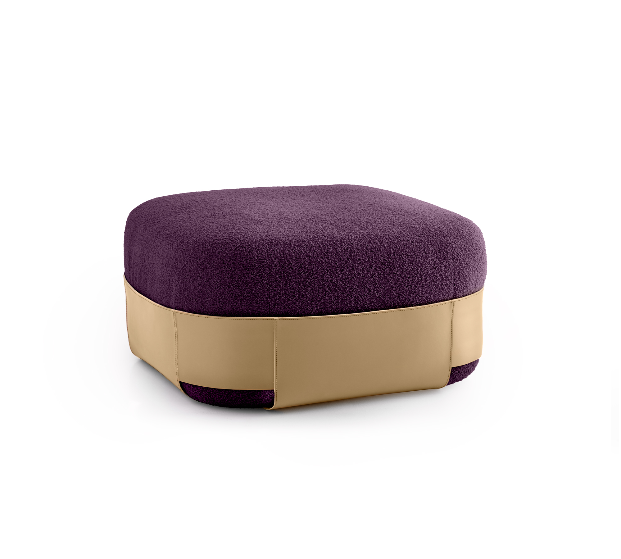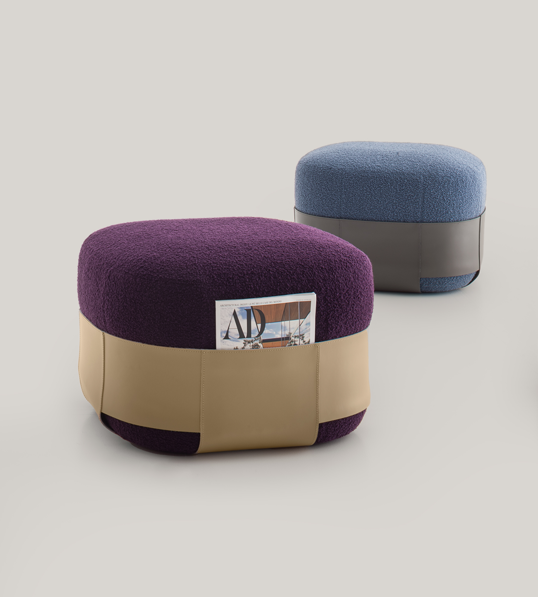 A highly functional pouffe that playfully takes its inspiration from sumo wrestlers. Its double genuine leather upholstery merges with the bouclé wool fabric to serve as a magazine rack, iPad holder, etc. An extra touch? The colour combination of fabric and leather is designed to bring a touch of style and colour into your living room!