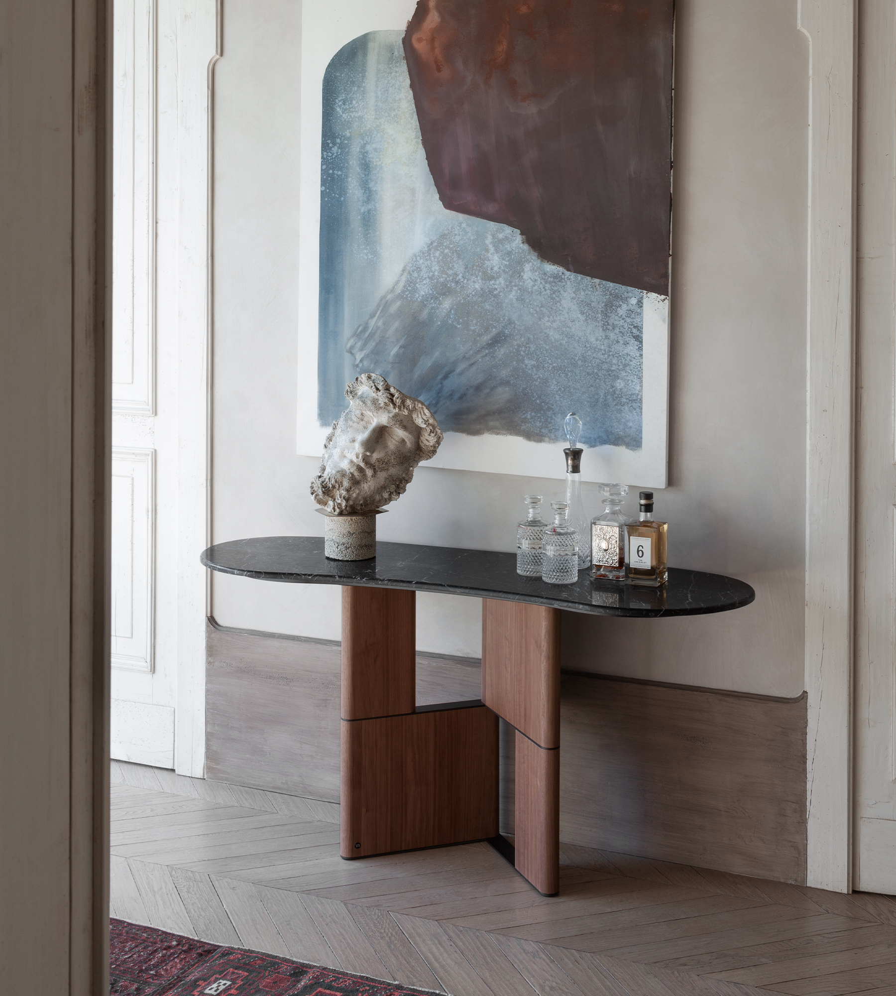 Le bois courbé de manière sinueuse et le métal se fondent harmonieusement, créant une base d’une valeur artisanale extraordinaire.