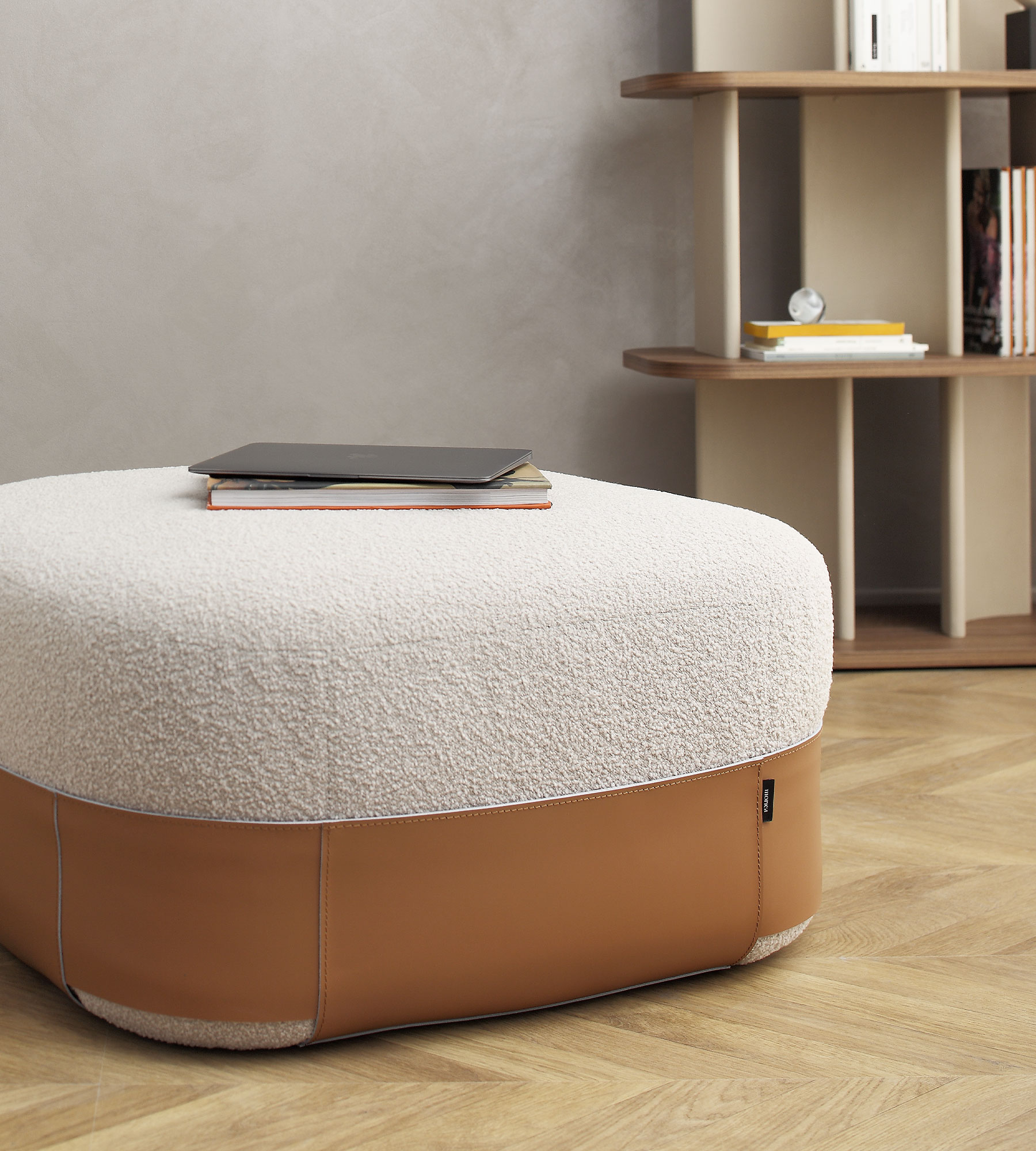 Un pouf extrêmement fonctionnel inspiré de façon ludique aux lutteurs de sumo. Ainsi, son double revêtement en cuir véritable se marie avec le tissu en laine bouclée pour servir de porte-revues, de support pour iPad, etc. Le détail qui fait la différence? La combinaison de couleurs entre tissu et cuir, conçue pour donner une touche de style et de couleur à votre salon!