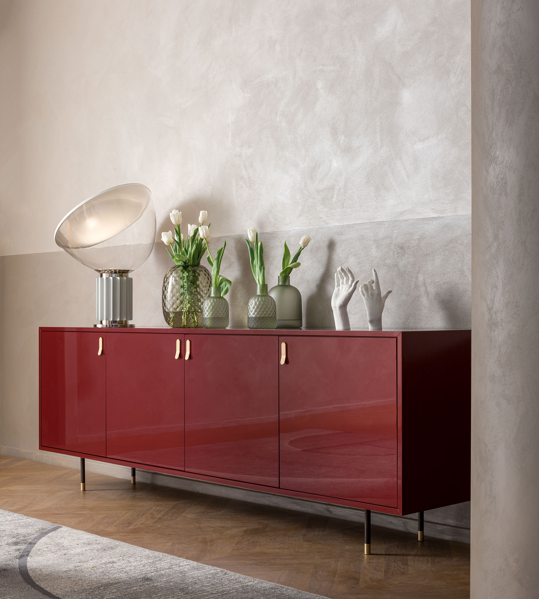 Un buffet simple seulement en apparence, qui exprime sa grande qualité dans la laque brillante 100 gloss, enrichi de détails en laiton qui en valorisent les nuances comme dans un univers liquéfié et brillant.