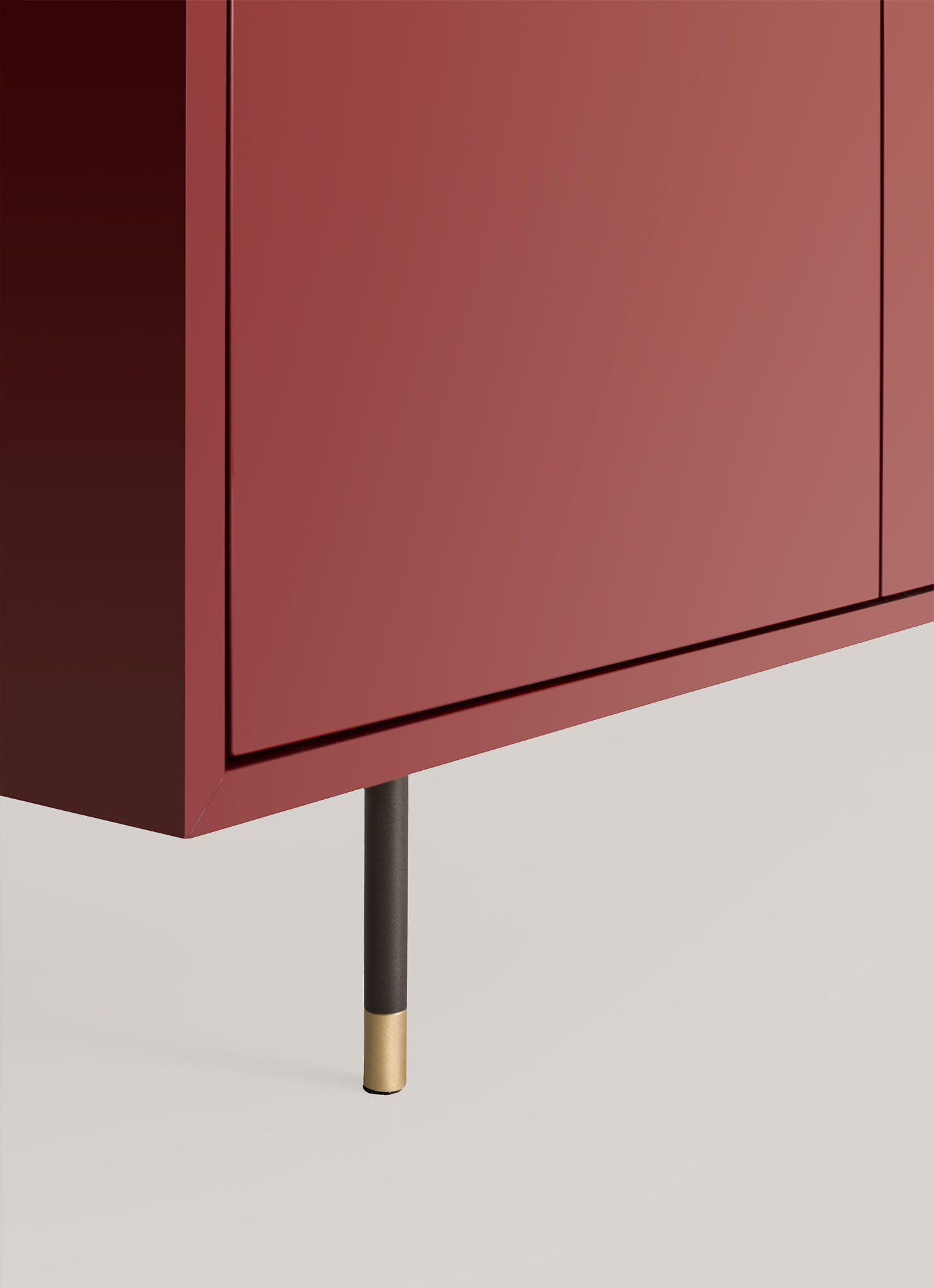 Buffet avec 4 portes en MDF laqué brillant rouge Marsala 100 et poignée en laiton. Quatre étagères en verre fumé transparent de 6 mm avec supports d’étagères réglables en hauteur. Structure en métal bruni avec détails en laiton. Charnières brunies et ralenties. Étagères supplémentaires en option sur demande.