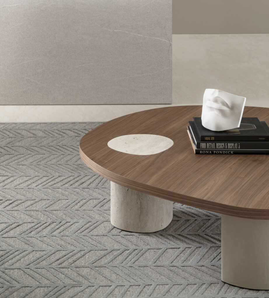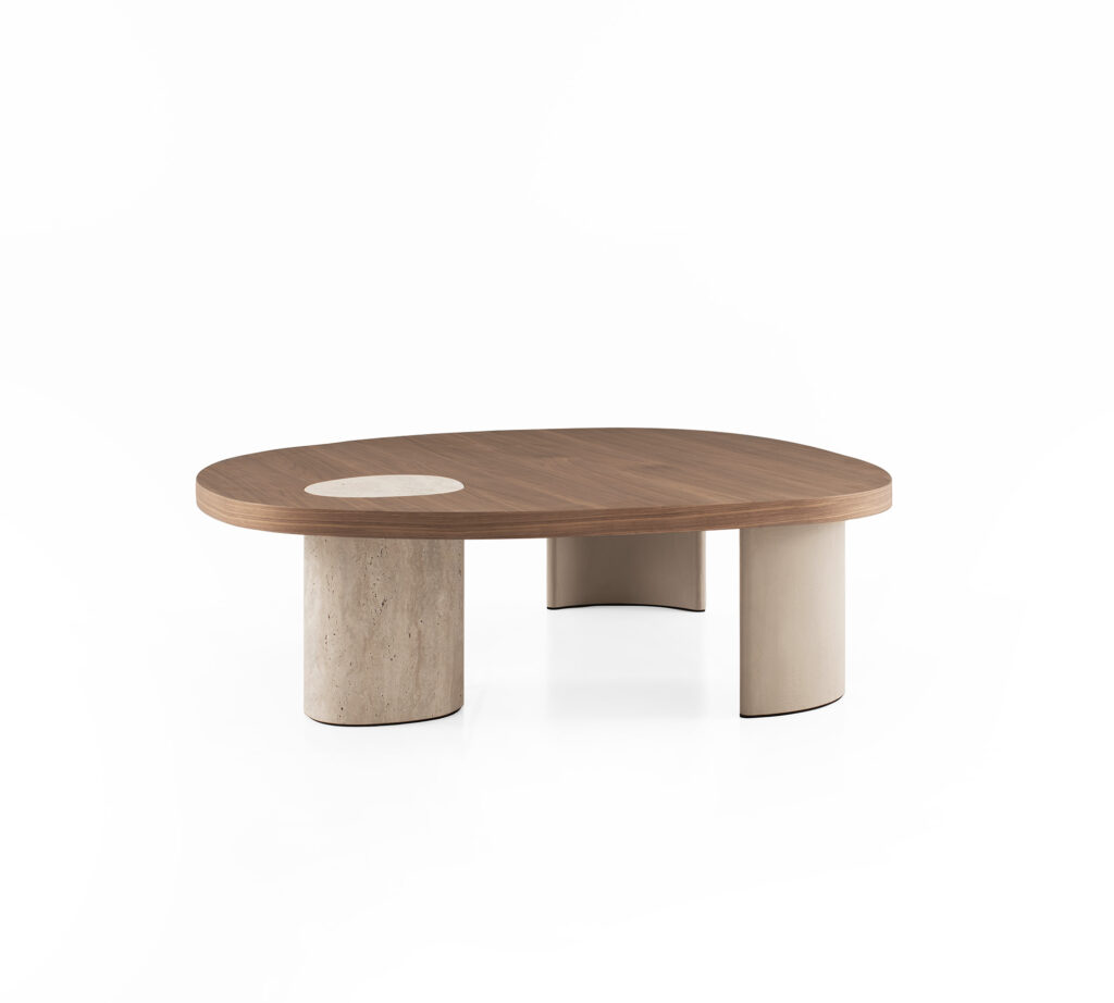 Ispirato alle pietre levigate dai fiumi, il tavolino Stone porta nella tua casa la bellezza delle forme organiche modellate dalla natura. Il piano in legno sembra galleggiare sopra una base scultorea in vero marmo tornito e una seconda struttura a contrasto, una parentesi arrotondata che aggiunge dinamismo e leggerezza.